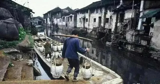 图上这活儿叫挑坛上船,穿蓝布衣的师傅一肩一担,坛子用稻草绳缠得紧紧,走跳板不响一声,小时候我跟着外公去打花雕,打回家一开塞,屋里立刻有股甜香味,做菜只需一小勺,味道就立住了。