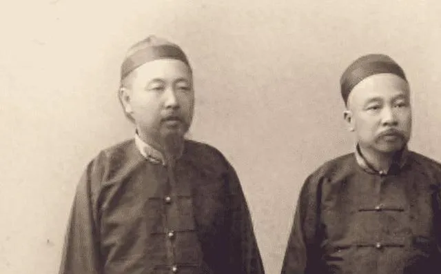 图中这身直身袍叫褙子,料子多半是绸缎,左边那位束着瓜皮帽,胡须修得齐整,面相沉稳,右边同样装束,扣子是盘扣,靠近领口的位置略有磨痕,说明衣服常穿不只是照相用,站姿一前一后,老规矩讲究主次分明,那时拍照少,能进影楼的,多半是有身份有体面的人家。