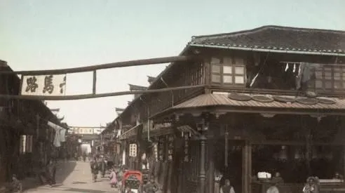 图里这道横梁叫牌楼,木制的,横匾写着路名,街面不宽,两侧是吊脚楼,檐口下晒着一圈圈竹匾,估计是晒茶或晒面,巷口停着小轿子,远处还能看见旱烟铺的幌子晃着,妈妈说以前上街买针线,走到这种牌楼底下就得收声,别太闹腾,过了牌楼才是另一条人间烟火。