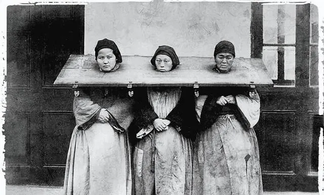 这个木板叫枷,沉得吓人,三个人脖子卡在里面,表情木木的,衣摆上泥渍干在褶里,那会儿法场讲究示众,既是惩戒也是震慑,小时候从族谱里看到过类似记载,爷爷合上书说,人要立得住心,别走偏,枷这种东西,宁可一辈子在书里看见,也别在人身上见。