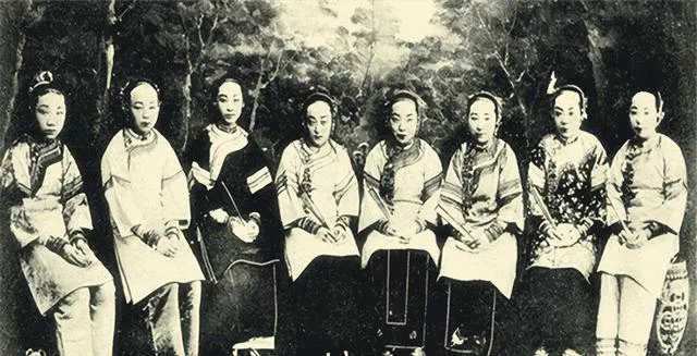 这排坐着的女子穿旗装,袖口宽,衣襟绣花繁复,脚下小鞋尖尖的,脸上粉打得匀,发髻压得平,奶奶看这种照片常眯着眼说,别老说女子柔弱,她们坐得比谁都直,规矩全在背上顶着呢,以前讲究步子小声儿轻,现在出门谁不是背上一个包手机一揣,路走得又快又直,样子不一样,骨气还得一样硬。