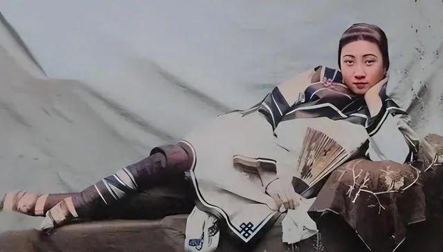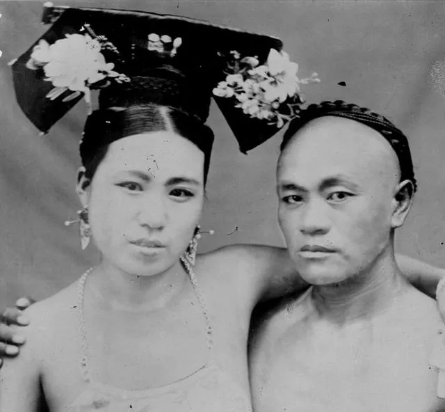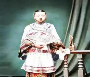 这里是满族新娘风俗照,头面繁复,额前坠子几乎垂到眉心,旁边的小侍女拎着衣摆,奶奶指着说你看,新娘子不笑的,旧礼讲含蓄内敛,现在婚礼恨不得把笑从早挂到晚,热闹归热闹,腔调却不同了。