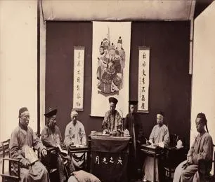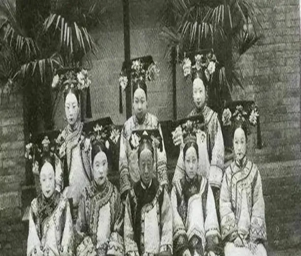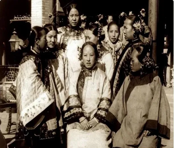 这个场景叫旗人女眷合影,发髻高高的,两侧插满花簪,袖口滚粗边,站着坐着的都有,都是旧朝气派,奶奶说她小时候见过这样的大袖袍,摸着有点滑,颜色却稳重,黑里透着绸光,现在穿旗装多是表演服了,料子轻了,味道却淡了。