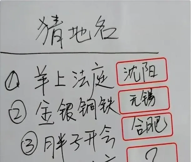 这张写着猜地名的题板,羊上法庭、金银铜铁、胖子开会,旁边用红框写着沈阳无锡合肥,都是顺口溜记忆法,像极了我小时候在堂屋里背省会,爸爸递块粉笔让我上前写,手一抖,写得歪七扭八,他笑着说不怕,记住就行,现在手机地图一搜就到,脑子却懒了半截。