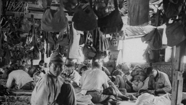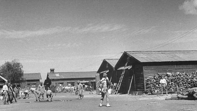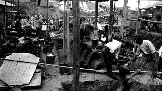 这个营叫“徒手官兵营”,图里的木屋顶下吊满背包,地上席子铺成一溜,炊烟在院子里打着旋儿,伙食不算差,锅里咕嘟咕嘟,管事的时不时敲铃,按号排队打饭。