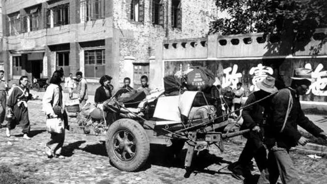 队伍像一条长蛇,沿着电线杆子拉出去很远,白旗在前面晃,走累了也不敢停,另一张是装满家当的车,锅碗瓢盆压在箱子上头,女人拎着布袋跟在后面,谁都不回头。