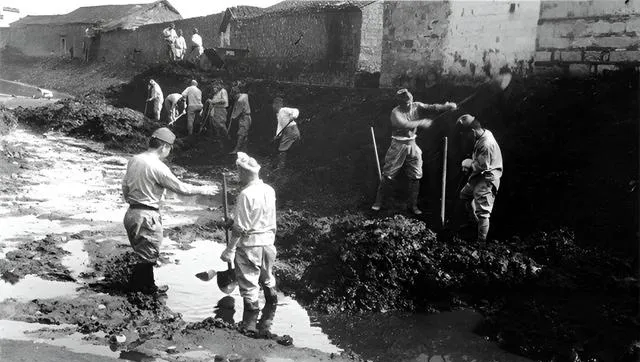 图中拿锹的多是“徒手官兵”,拆掉他们自己立的路障,清理淤泥,汗水把脊背的布打得深一块浅一块,之前是侵略的手,如今拿起工具干脏活累活,这就是规矩。