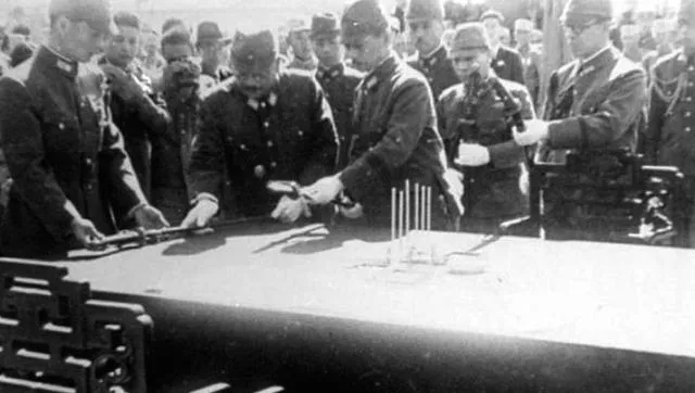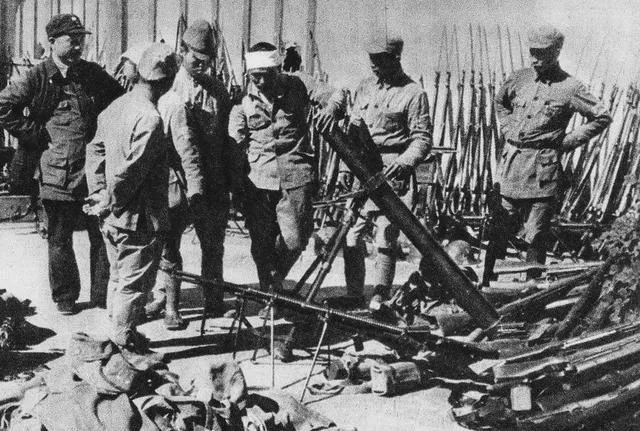 这个场面叫受降,图里军装整肃的中国军人拿着名单,一个个清点,刀械摆在桌上,长枪短炮码得像墙一样高,爷爷说那会儿有个规矩,先登记姓名番号,再把武器堆放统一封存,谁敢藏一件,立刻带走问话,干脆利落。