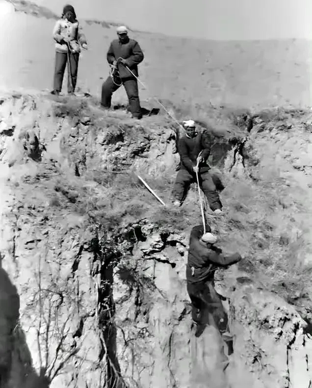 图中这根粗麻绳叫救援绳,崖顶三人一前一后把力道分开,最下面那位拽着结扣往下探,裤腿上都是尘土,风一吹人影发颤,可心更紧。