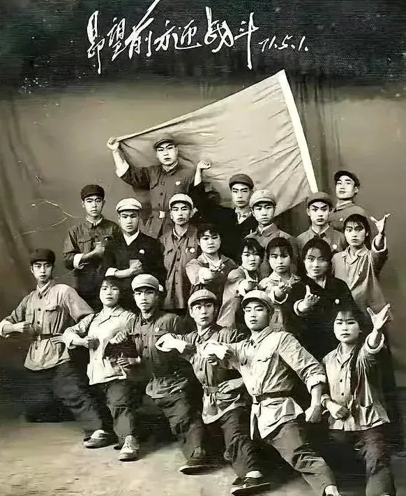 这一群人摆着整齐的手势,旗子铺在后面,眼神锋利,鞋底子都是布面的,地板上擦得能照影。