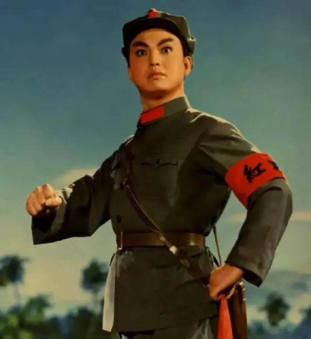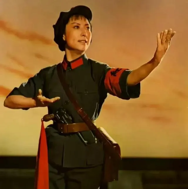 她腰间别着盒子枪,袖口红绸醒目,抬手那一下干净利落,舞台灯光把面庞烫出一层亮。