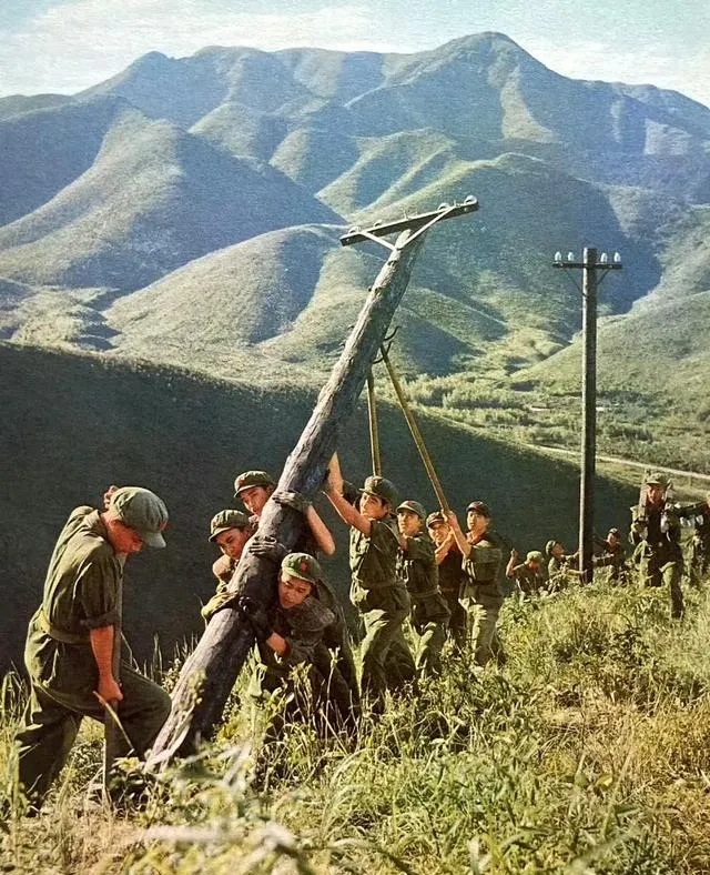 这根木电杆比人还粗,十几个人一齐使力,绳子在肩上勒出一道深印,山脊线起起伏伏,口号一喊,回声绕着山沟打圈。