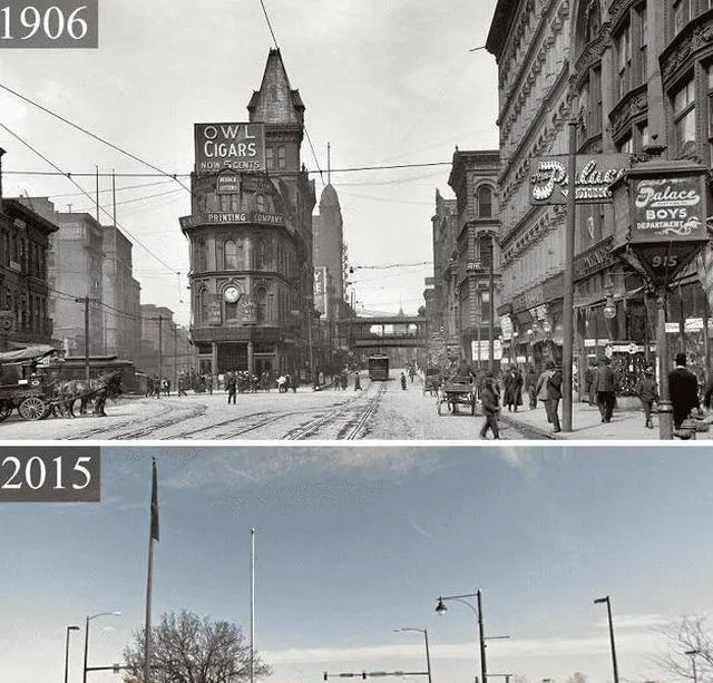 图中这组一上一下的对照叫“老城新景”,上面马车辘辘,下面车道笔直,电线像蜘蛛网一样挂在空中,旧时的钟楼挺着尖帽子,像个不服老的长者,小时候我第一次看到这种并排的老照片时还嘀咕一句,现在干净多了是没错,可味道淡了点。