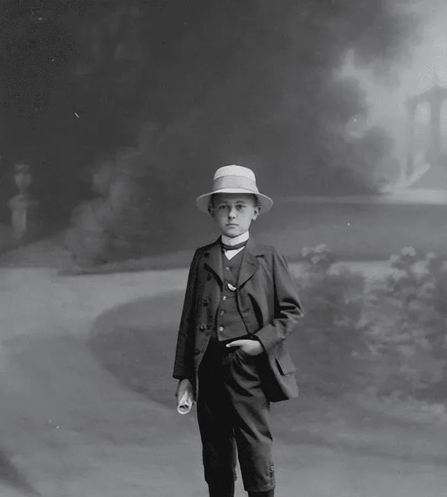 图中小帽子小西装叫“童子礼服”,硬挺的呢料,扣子亮亮的,腰间还别着链子,站姿端正得像小大人,奶奶看见这种照片就笑,说以前出门讲究穿戴,现在可好,孩子一件运动衫能穿四季。