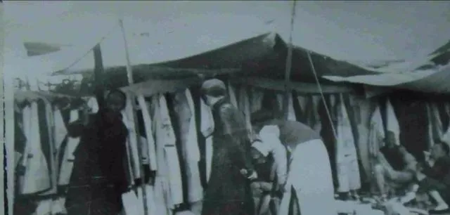 图中这排衣服叫估衣摊,就是旧衣服买卖的路边摊,绳子牵着篷,篷下拉着一溜长袍马褂,棉的绵的夹的全挂齐了,摊主腰间一把铜算盘,手一拨珠子脆生生,挑衣的顾客把袖口捏在指头上打量布眼,说句“成色一般”,又弯腰去翻箱子里的便宜货,奶奶说那会儿买衣先看补丁补得利不利索,再看领口有没有油光,能穿过冬就合算了,现在买衣服动不动就讲版型和剪裁,当年讲的就是耐穿二字。