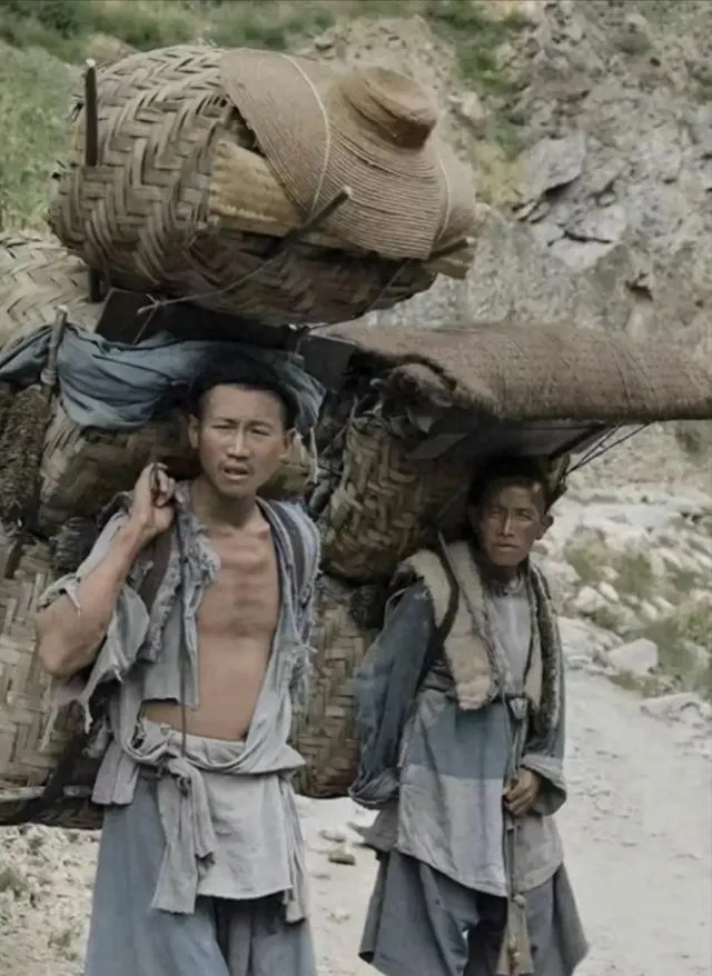 图中这肩上的大竹篓叫背篓,粗藤绕骨架,口沿宽厚,肩上再垫一块破毡,防勒得生疼,山路一走就是一天,回到家只想往炕上一趟,奶奶说那会儿男人的腰是拿活儿硬撑出来的。