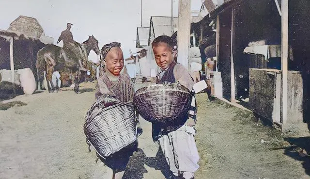 这两个提筐的娃拿的是柳编篮,边缘磨得发亮,笑得像花,多半是帮家里跑腿的,买盐也好换针线也好,回家得先被娘亲摸摸衣襟问冷不冷,再塞一口热窝头。