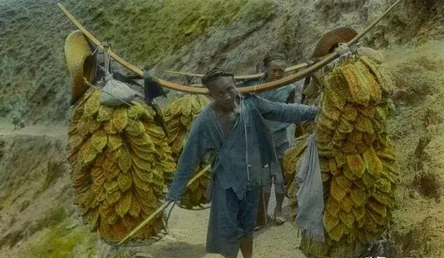 肩上这两挂黄灿灿的是烟叶,叶片一层垒一层,绑在扁担上厚得像墙,走起山道来人晃叶也晃,喘息声和扁担吱呀一块儿响。