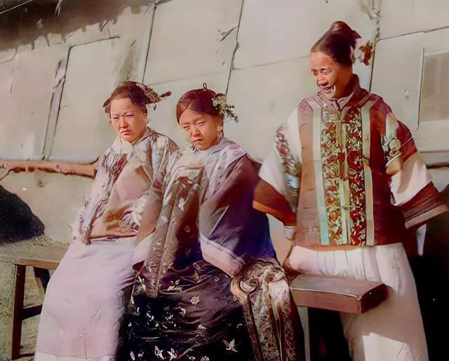 图里三位穿的是绣面袄裙,袖口团花密密,腰间用绦带一束,坐姿端着,眼神却有点躲,窗外风一吹,绣线的亮片颤了一片。