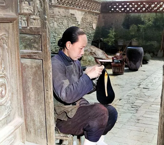 这个坐在门槛上忙活的活计叫补帽沿,图中这顶是黑呢子小圆帽,内衬是黄色绸边,针脚细密,手里拈着的蜡线有股温润的亮光,奶奶说帽子要常修补,线贴着边儿走,风一吹才不翘边,过去东西不轻易换新的,现在商场一排排,坏了就扔,这点手上功夫就少见了。
