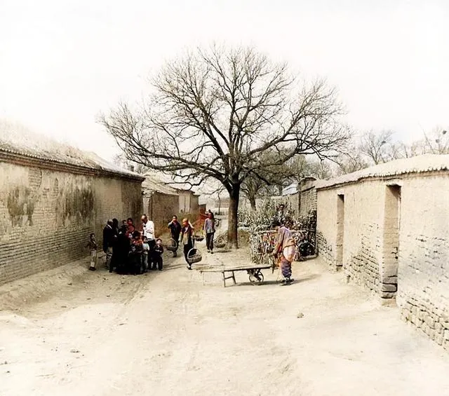 图里的这条巷叫打麦场边道,独轮车杵在树下,车把上缠着麻绳,孩子们围着热闹,谁家有喜事谁家换窗纸,消息全在这条道上传开,过去一条街能装下全村的事儿,现在路宽了,心却散得快了。