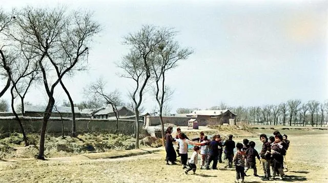这个场景我们那儿叫拉花圈,图中一圈小孩手攥手,脚底下是软土,鞋底拍一下扑扑的土味儿,笑声沿着沟坎跑出去,小时候玩意儿不多,可开心不打折,现在哪都智能玩具,反倒凑不起来这么大一圈。