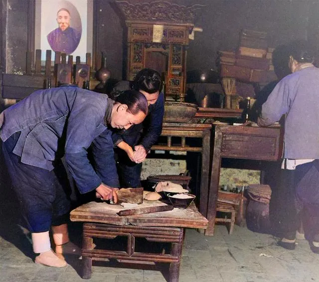 这个矮桌叫案墩子,图中男人正压面,木擀杖磕在案头咯噔一声,旁边炉门半掩着,锅里咕嘟咕嘟,馒头一笼接一笼,逢年过节蒸得满院子热气,孩子们蹲桌角等头锅,手都烫红了也要抢一个。