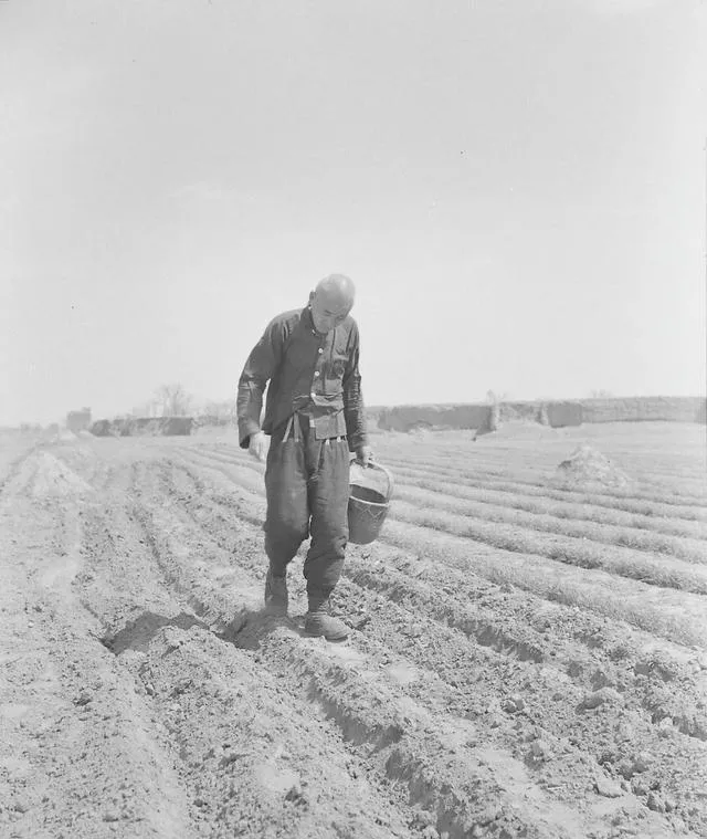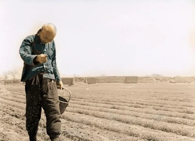 这张是撒籽的近景,籽顺着指缝漏下去,像撒胡椒面一样匀,风要顺,手要稳,脚下的沟垄像琴键,走一步响一声,种下的是盼头。
