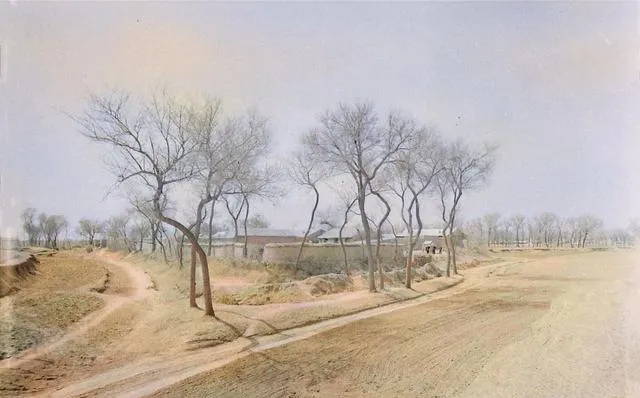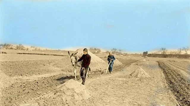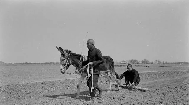 这个套具叫辕套,驴在前面走,后头是木犁,儿子牵着缰,父亲扶着犁壁,沟垄一道一道翻出来,远处通州城墙影子若有若无,春天的地皮翻得透气,风吹起来像能听见土呼吸。