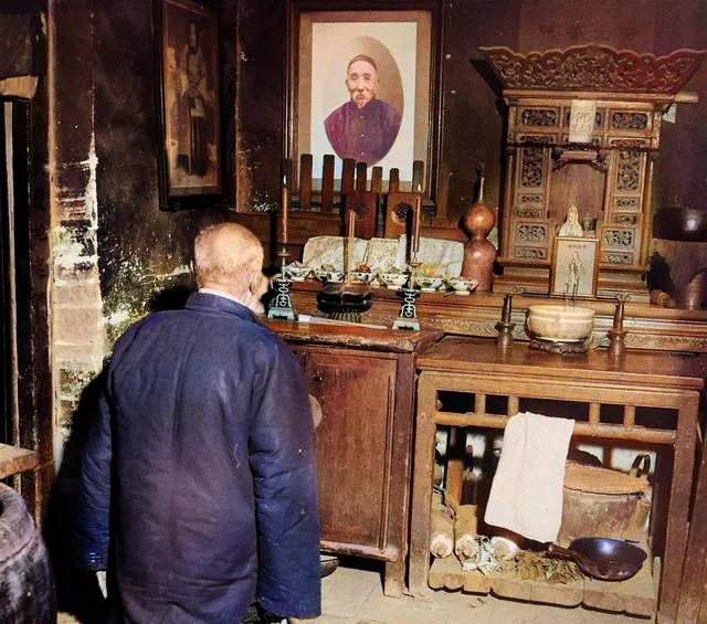 这个柜子叫供柜,抽屉拉手是铜团寿,台面上摆烛台香炉,一张黑白画像镇在上头,老爷子站着看了半天才跪下,嘴里念叨着“老祖宗保佑”,那一刻屋子安静得只剩香火的细响。