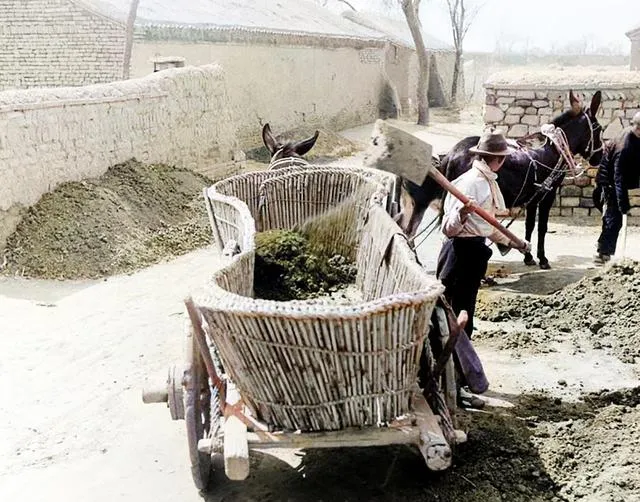 这个大个头叫粪箕车,竹编车厢肋条密密,前头套着骡子,男人扬锹装车,粪堆像小山,一车拉到田边,翻在垄沟里养地,奶奶笑说这玩意儿臭归臭,是真金白银的肥,年景就指望它。