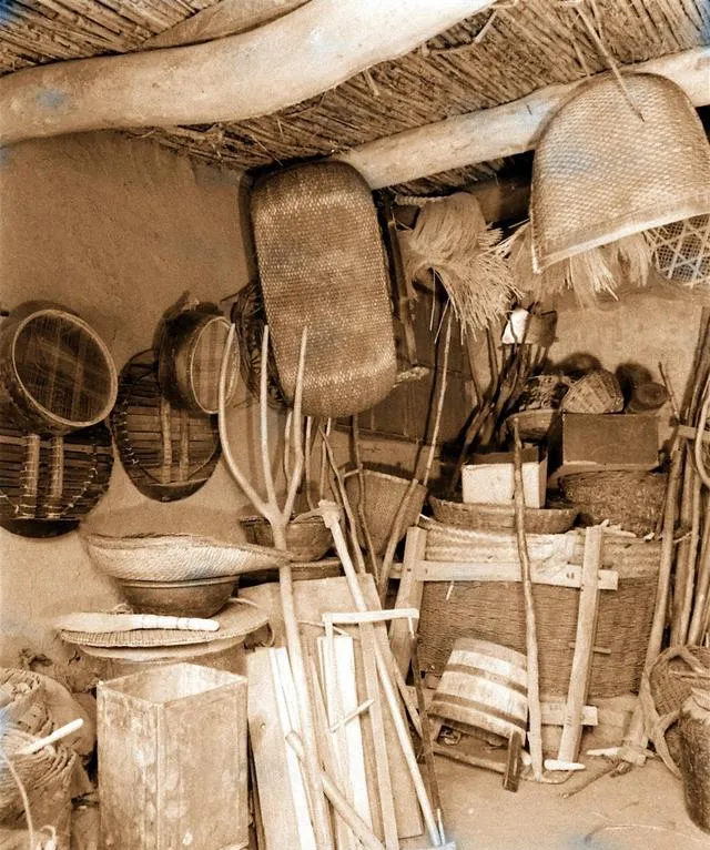 这间小屋叫堆房,墙上挂着竹筛、簸箕、藤筐,角落里立着木叉、连枷,还有一摞木板子,爸爸指着说这把是扬场的扇车摇把,那根是捅灶的铁通,名字别看土,可好使得很。