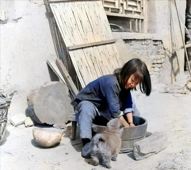 这个圆木器叫栎木盆,小姑娘挽着袖子洗豆子,旁边靠着两扇竹帘门,猫狗拱着边儿瞅,水光一晃,笑也跟着晃,家里没几样玩具,木盆照样能玩半天。