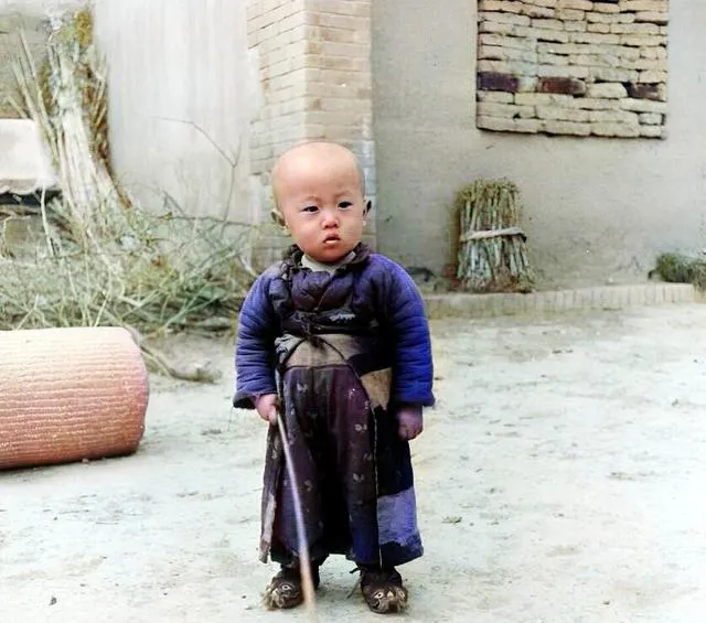 这个小家伙穿的是打补丁的棉袄,脚上老虎鞋,腰里还别着屁帘,手里的短棍是“大将军令”,他站那儿不吭声,风一吹,衣摆飘起来像要出征,妈妈笑着说别扎到鸡窝里去。