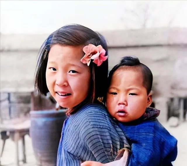这个背孩子的法子叫背褡,姐姐肩上挽着布带,弟弟脸蛋红扑扑,姐姐头上夹一朵布花,走起路来一颤一颤的,家里人手不够,姐弟早早就会照顾彼此,懂事来得快,也甜。