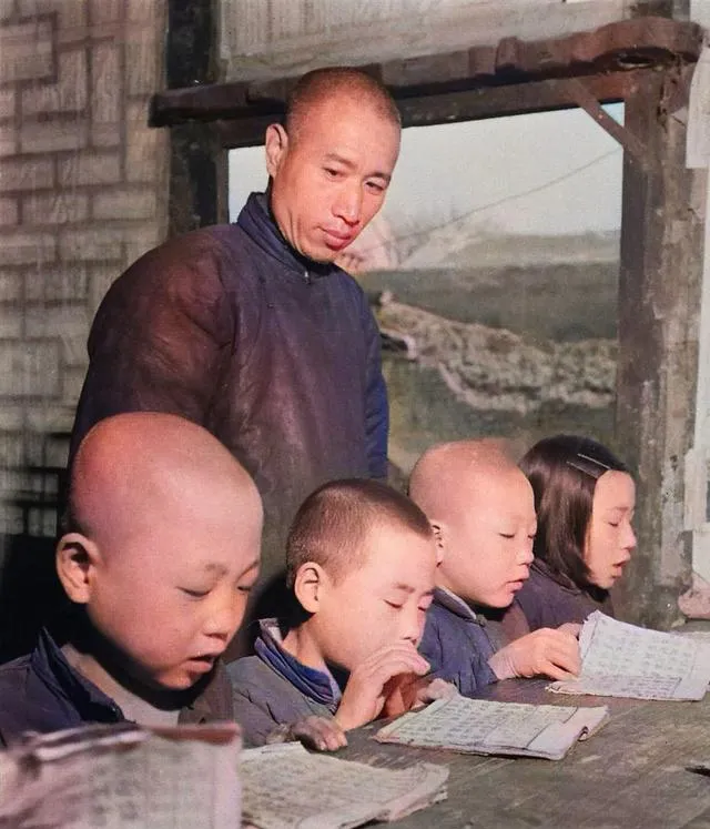 这一幕是晚自习,孩子们手按着描红本,先生背着手在后面巡,窗外有风,纸页“沙啦”一响,灯影把每个人的眉眼都照得很认真,那时候读书不易,现在书多了,安静读书的人反倒稀罕了。