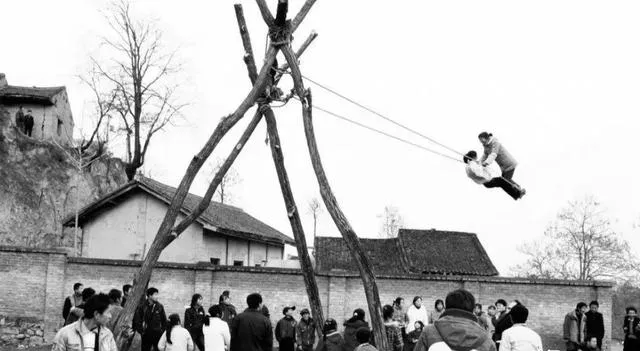图里这架高过屋脊的木秋千,老家叫打秋千的架子,几根粗树干三角支着,绳子抻得直直的,腊月里人一上去就往天上冲,吓得旁边孩子缩着脖子看,村口热闹的日子就靠它撑场面,娘说以前谁荡得高谁面子大,可也得留神,风一偏,人就得学着收脚落地。