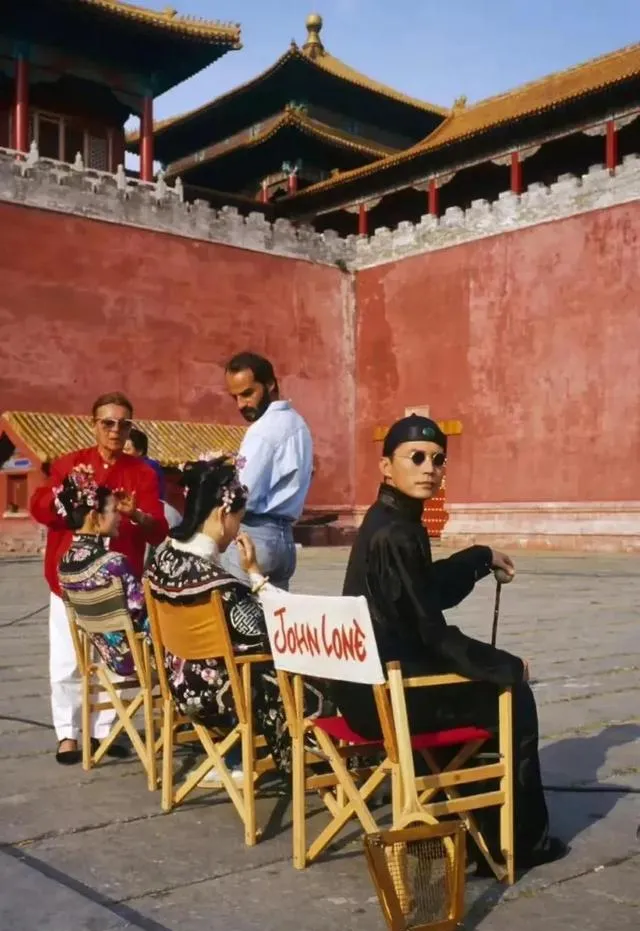 这张在城墙下排着椅子的照片,椅背写着英文名,短墨镜的男演员回头看,旁边是化妆的戏服姑娘,这是午门外拍电影的场景,剧组的木箱子和折叠椅都在地上排好,爷爷说他那年路过,远远看热闹,没想到后来电影成了经典,如今景区人多,剧组都往棚里去,街拍的自由少了。