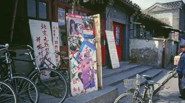 这条胡同口的展板贴满了磁带海报,无线电厂的销售部就这么摆着,玫红绿蓝的封面挤在一块儿,车把上绕着橡皮筋绑报纸,店门红漆剥落,风一吹海报角咧开嘴,小时候攒半个月零花钱,才能买一盘最想听的,回家按着录音机的两个键,怕按重了卡带。