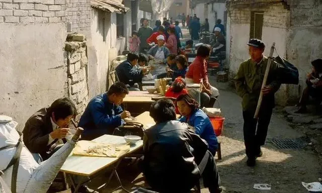 这张小巷里摆满桌子的,是早市小吃摊,粗瓷碗里热气腾腾,担子往肩上一撇,穿军绿外套的老汉从人缝里过,酱香和蒜味混在阳光里,妈妈说那时候吃碗热面能顶半天力气,现在外卖一滑就到,味道却少了锅边那层焦香。
