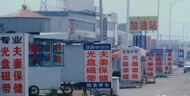 这个一排排的牌子,写的都是“光盘磁带”“补胎贴条”“加油站在前方”,红底黑字,立在风里抖,旁边是铁皮小屋,里头烧着红红的电炉,老板穿件军大衣蹲门口嗑瓜子,爸说那会儿跑长途靠这些小铺子续命,渴了买瓶矿泉水,困了躺板床打个盹,现在导航一设,哪儿都有服务区,路也不那样荒了。