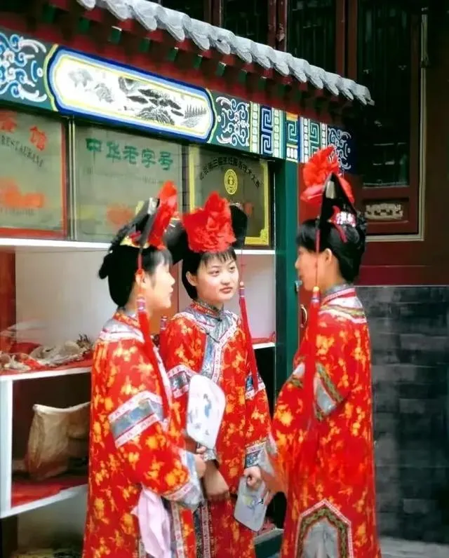 图中这三身红缎子叫唐装,领口立起来,滚着金边,头饰插着大红翎子,站在牌匾底下说话,袖子里的小折扇露一半,服务员姐姐笑说“里边请”,那几年古装剧火得不得了,大家都愿意穿点有样儿的,拍个照留念,奶奶看了说花是花,就是走起路来不如棉袄利落。
