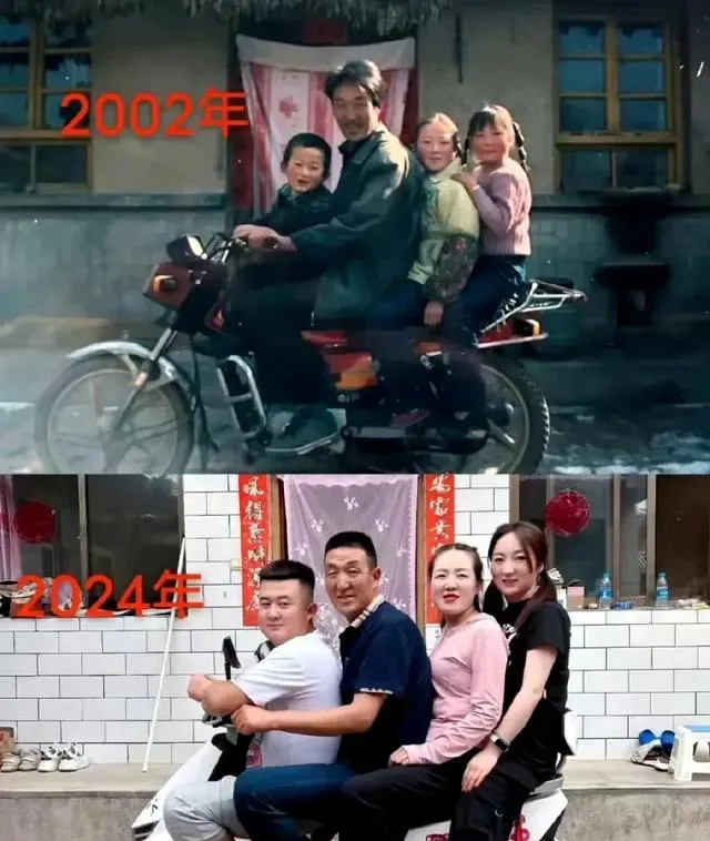 最后这个对比最扎心,上面是2002年,一辆小摩托驮着一大家子,孩子扒着把手笑得见牙,下面是2024年,同一扇门帘,同一处院台阶,人都长开了,车也换成了电动的,爸爸的背还是那么直,妈妈的笑眼还是弯的,叔说这二十年里,“我们的生活是近二十年渐渐好起来的”,房子翻修了,路硬化了,手机能视频了,可院口那棵槐树还在,夏天一到,蝉一叫,还是老味道。