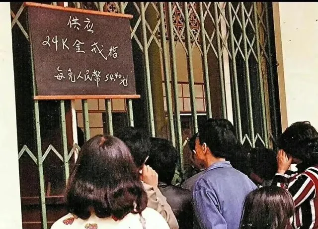 这个场景叫供销社的金饰窗口,铁栅门拉着,黑板粉笔写明白了24K和每克标价,队伍弯到转角处,妈妈说那会儿买个细戒指得攒好久,工资袋里的皱票子一张张抚平,轮到自己时心里咯噔一下,生怕断货了。