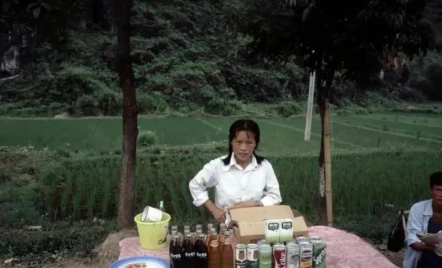 图中这张桌子上摆满了玻璃瓶和易拉罐,颜色一排排站得整齐,小塑料盆里泡着冰水,女摊主把纸箱翻过来当垫子,身后就是稻田,蜻蜓贴着水面飞,以前喝汽水要拧开铁盖,咔哒一下特别脆响,现在小朋友拿起就是气泡水,味儿淡了,人却更忙了。