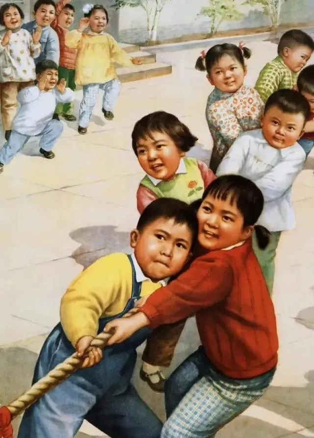 这幅招贴画里的小朋友红脸憋劲儿,棉袄鼓鼓囊囊,辫子晃来晃去,操场上白粉线还没干,老师在一旁拍手助威,画得真,脸蛋是麦色的,笑里带着汗味儿,我小时候把这类画贴在书桌前,写作业累了瞥一眼,心气就上来了。