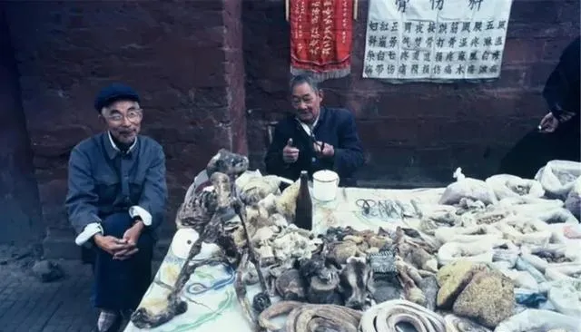 图中这摊位铺着粗布,骨头角料和干货堆成小山,摊主叼着烟笑眯眯的,另一位手里把玩着刀鞘,墙上还挂着宣纸招子写着包治百病,外婆拽着我胳膊说,看看就行别乱摸,价钱是喊出来的,听声儿就知道要不要砍两句。