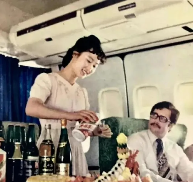 这个场景叫老式航班的头等舱,空乘把饮料倒进玻璃杯里,桌上摆着酒水和水果拼盘,后排的绿织物座套是那个年代的味道,听叔叔讲,以前上天一次像过节,能喝到好酒吃到烤鸭,现在大家飞来飞去忙得很,落地就赶会儿。