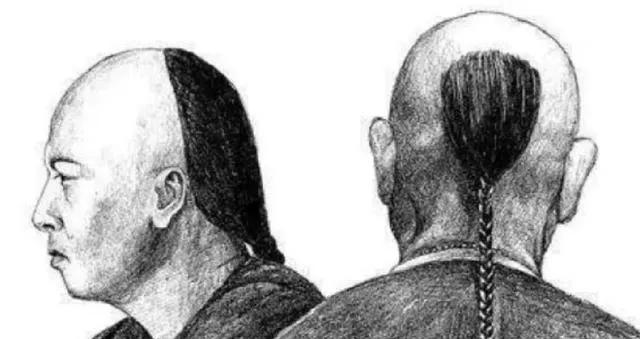 图里这两幅示意,左侧半剃,右侧完整的顶心,配上官帽和朝服,辫子就从后脖颈垂下去,帽顶子嵌宝石,衣襟绣补子,形制齐全,里子却被一根辫子拴住,朝上讲仪制,朝下讲规矩,规矩绕来绕去还是那句,留辫是顺,从头顶到脚底,规矩比风更冷。
