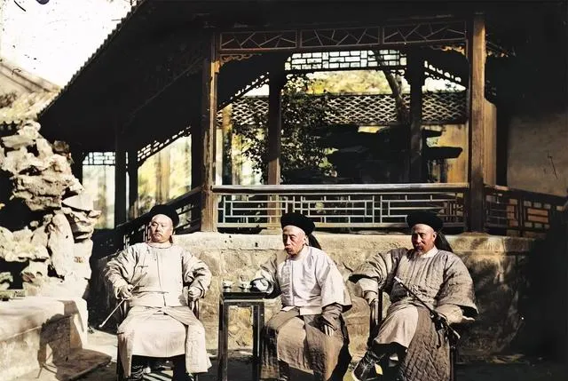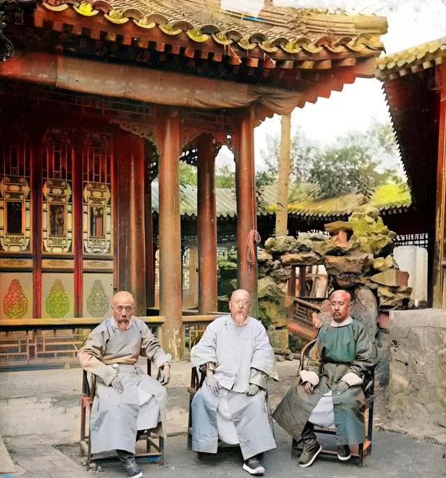 三位并排坐在院子里,椅子腿挪得很近,膝上叠袍角,交谈的劲儿像刚停住,背景是彩绘廊柱和假山叠石,细看还能见到鞋尖上的补丁,说明这些衣服并非件件新做,以前能补就补,现在破了直接换新的,我们的节省和耐用,都在这种不经意的缝线里。